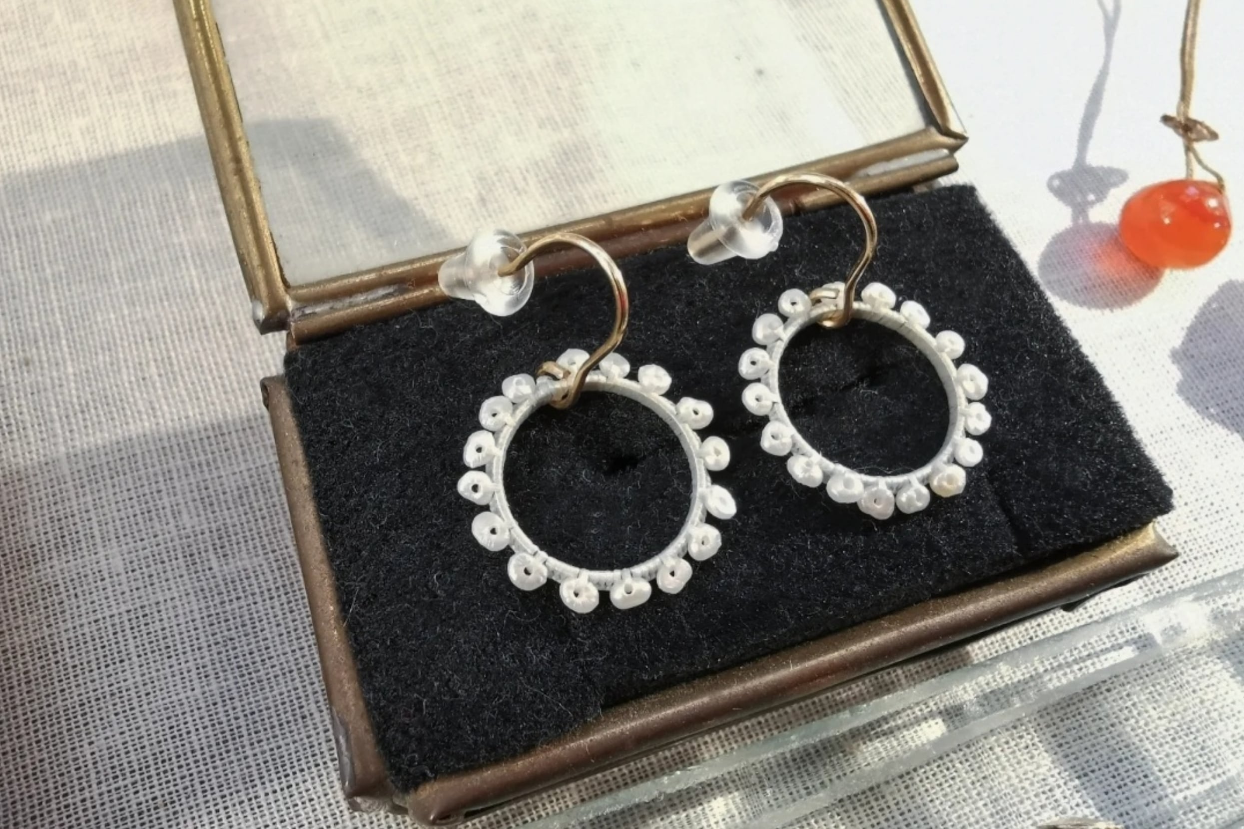 金属のフープにグレーの糸を巻き編みながら、極小の淡水パールも編みあげる技法でひとつひとつつくれられています
