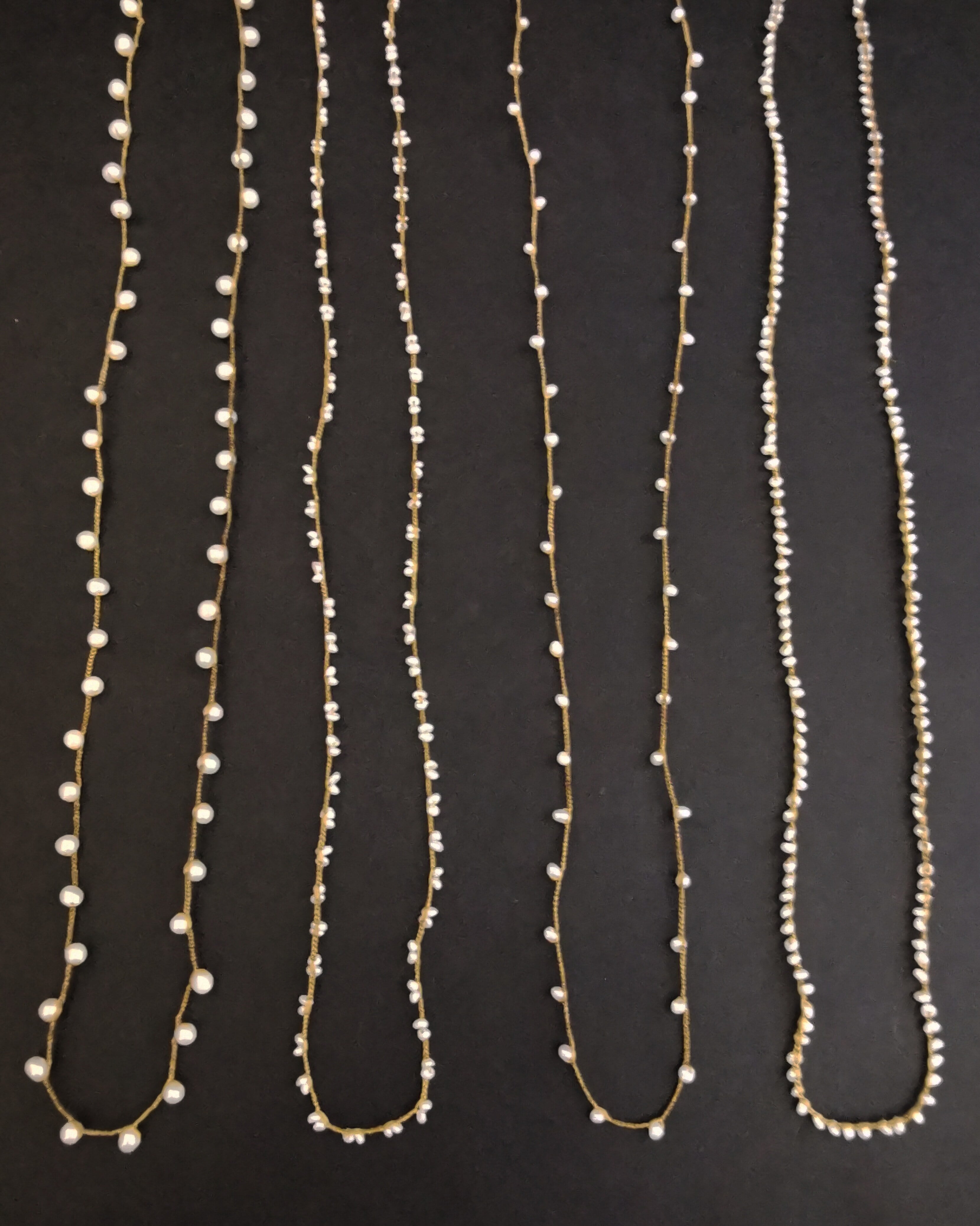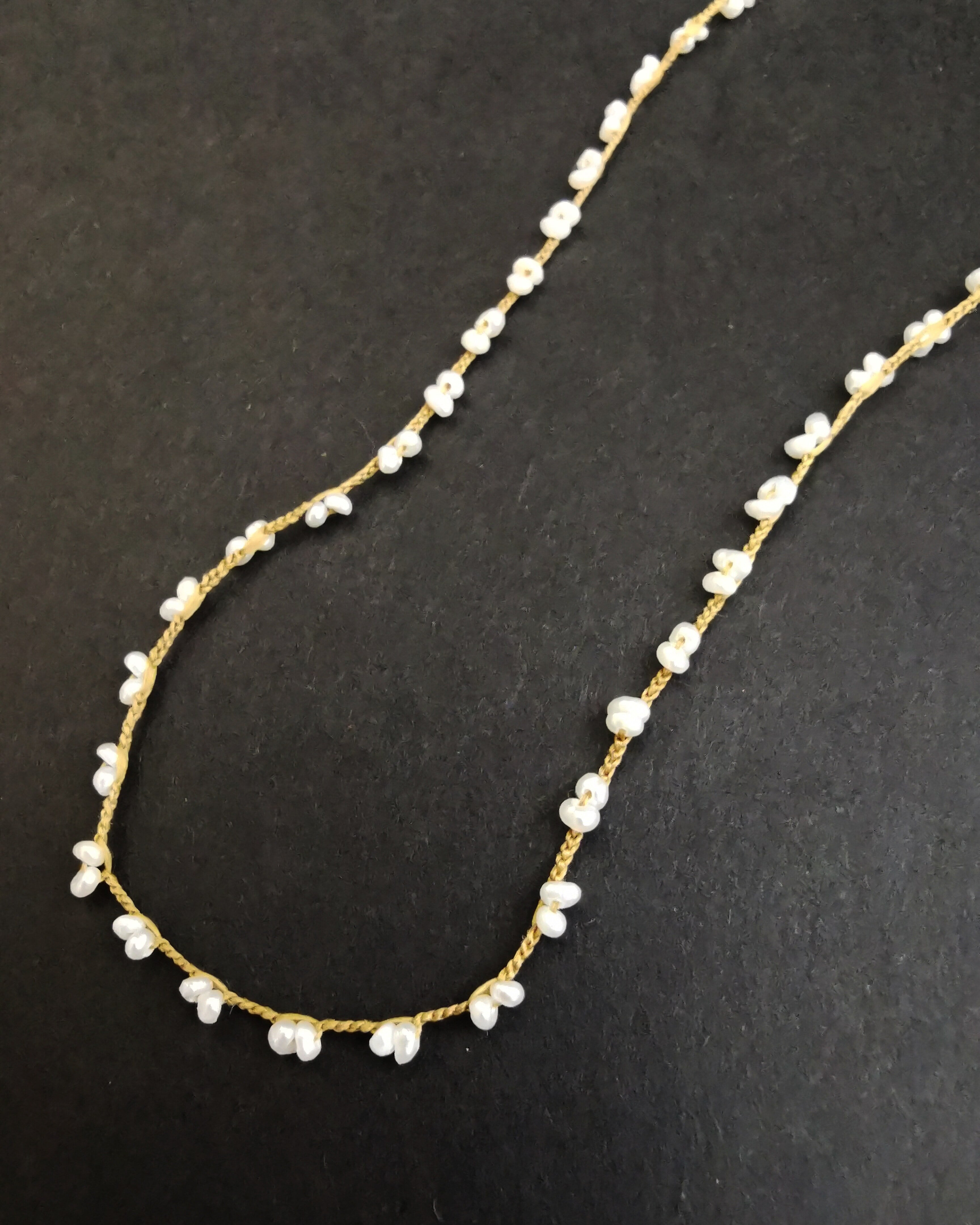 極細のシルク糸を細かく編みあげて、小さな粒の淡水パールを編みとめる技法でひとつひとつつくれられています