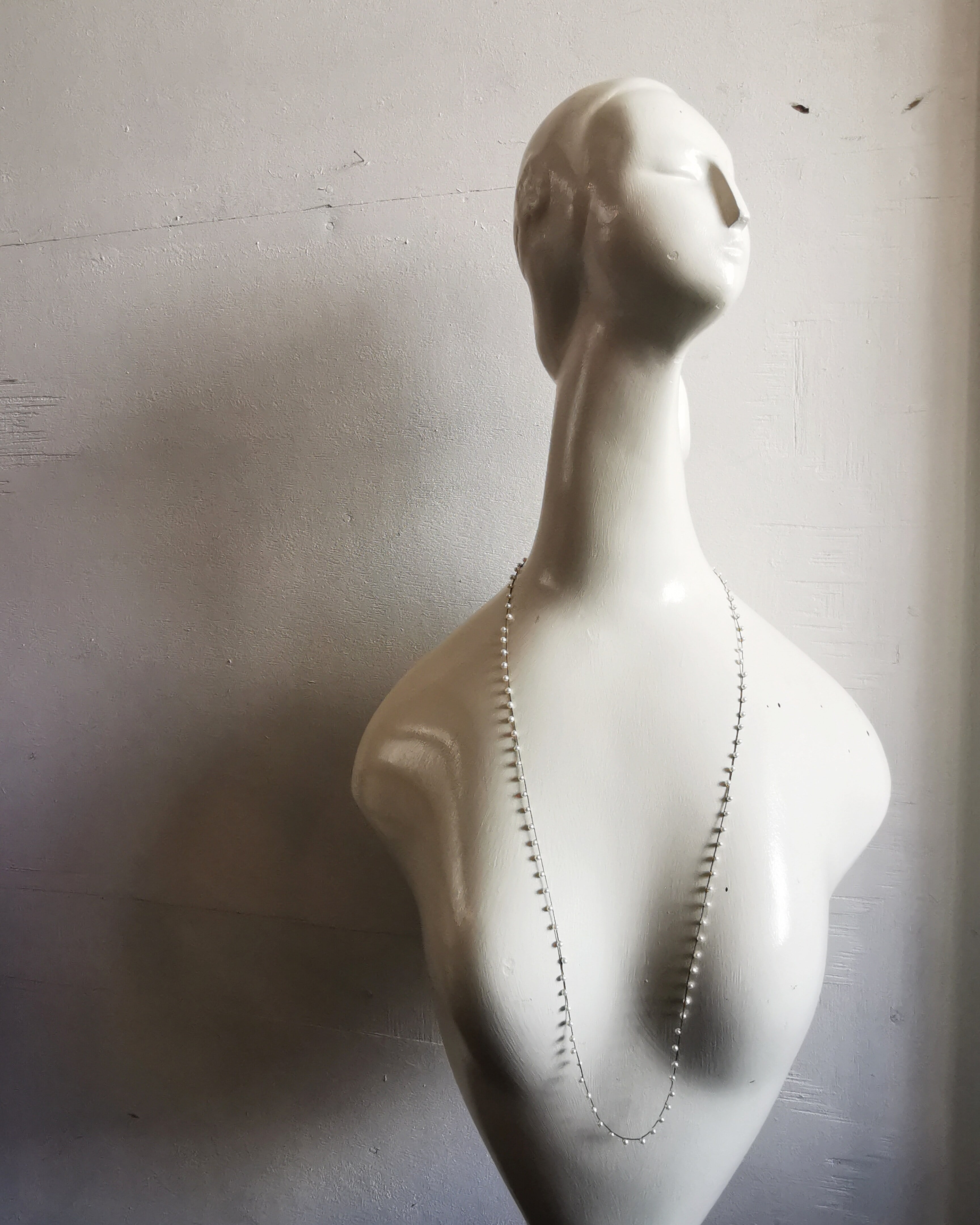チェーンネックレスとは違い、糸のよれがでることで、首元につけた時に直線ではなく