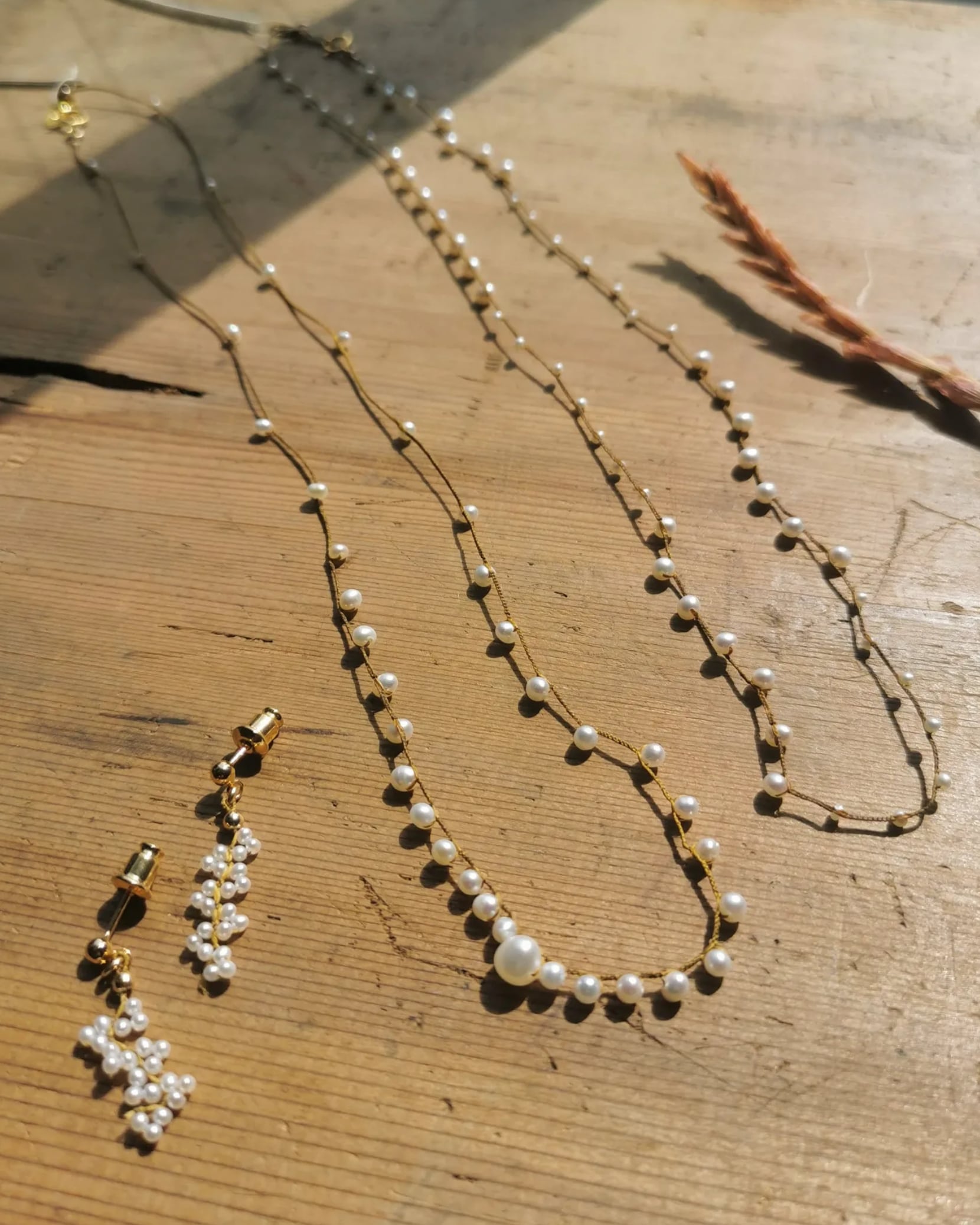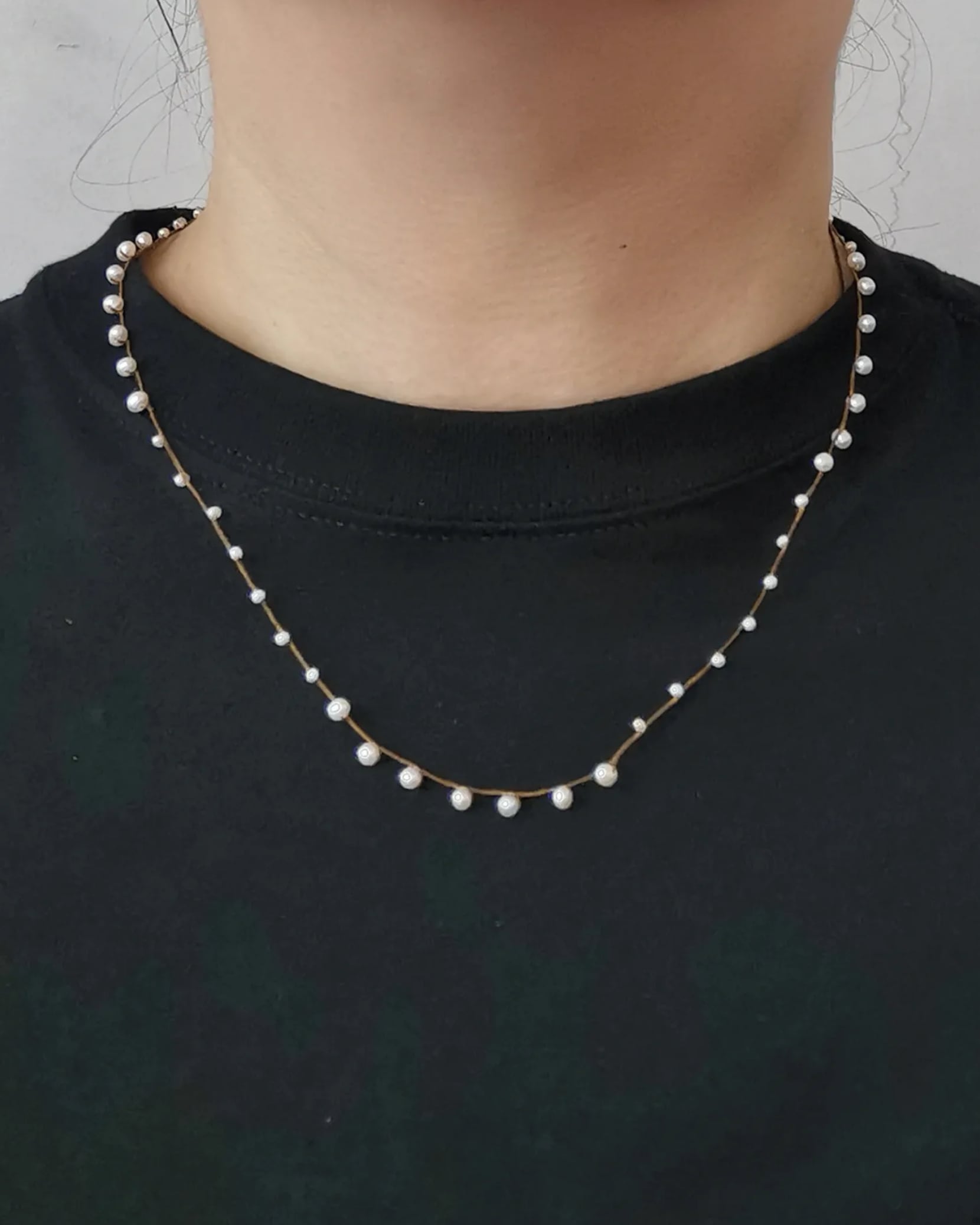 チェーンネックレスとは違い、糸のよれがでることで、首元につけた時に直線ではなく